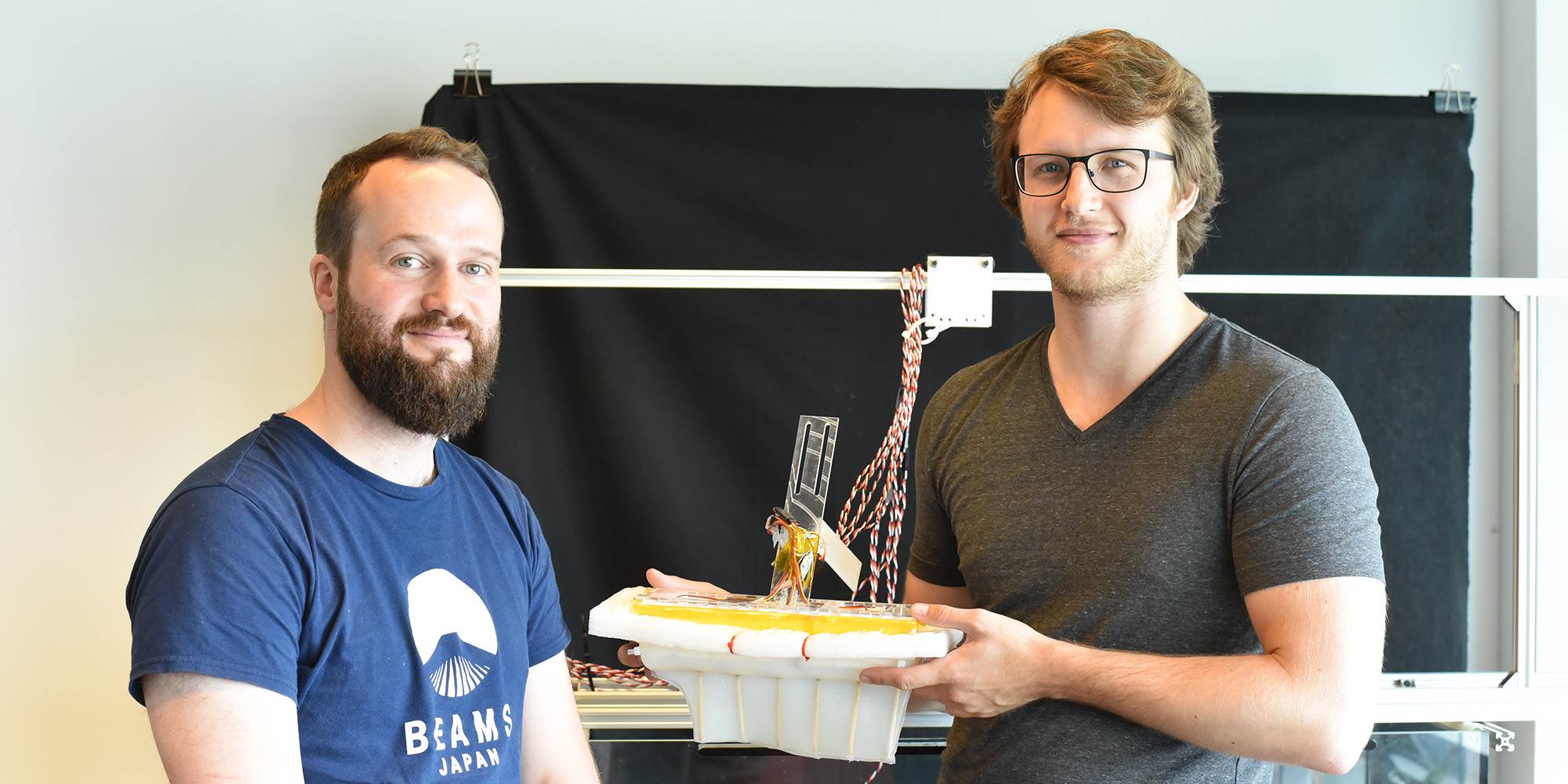 Ph.d.-studerende Jonas Jørgensen og Frank Veenstra med svømmerobotten.Forskerne brugte en evolutionær algoritme til at få robotten til at bevæge sig fremad i vandet så hurtigt som muligt.